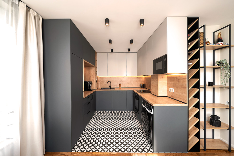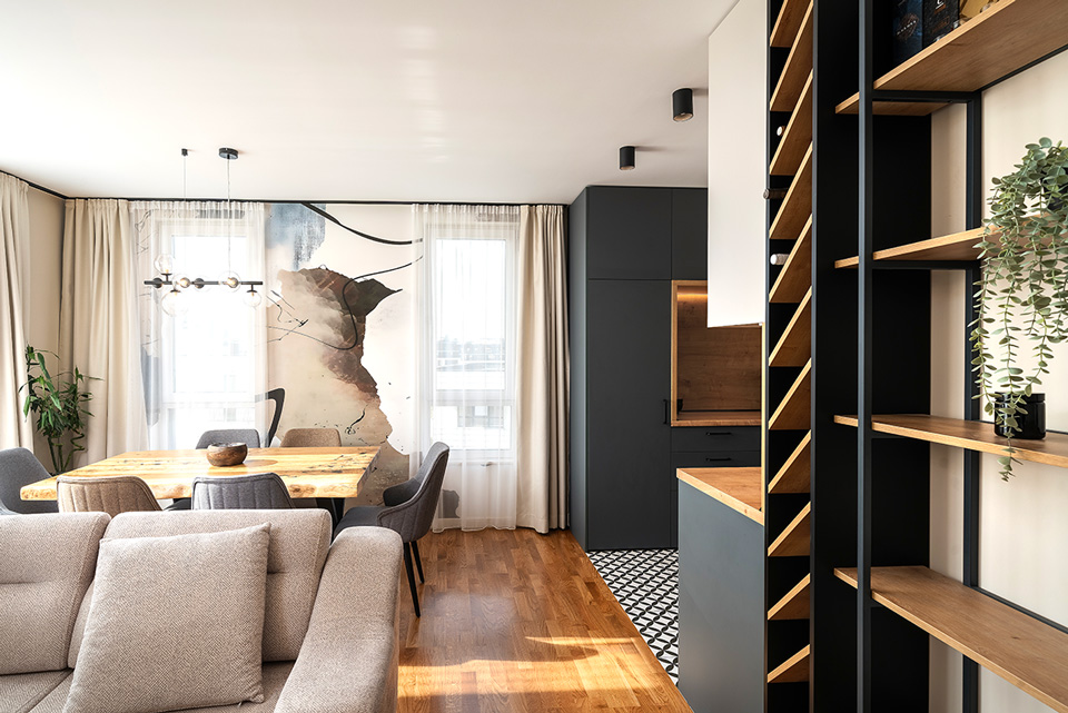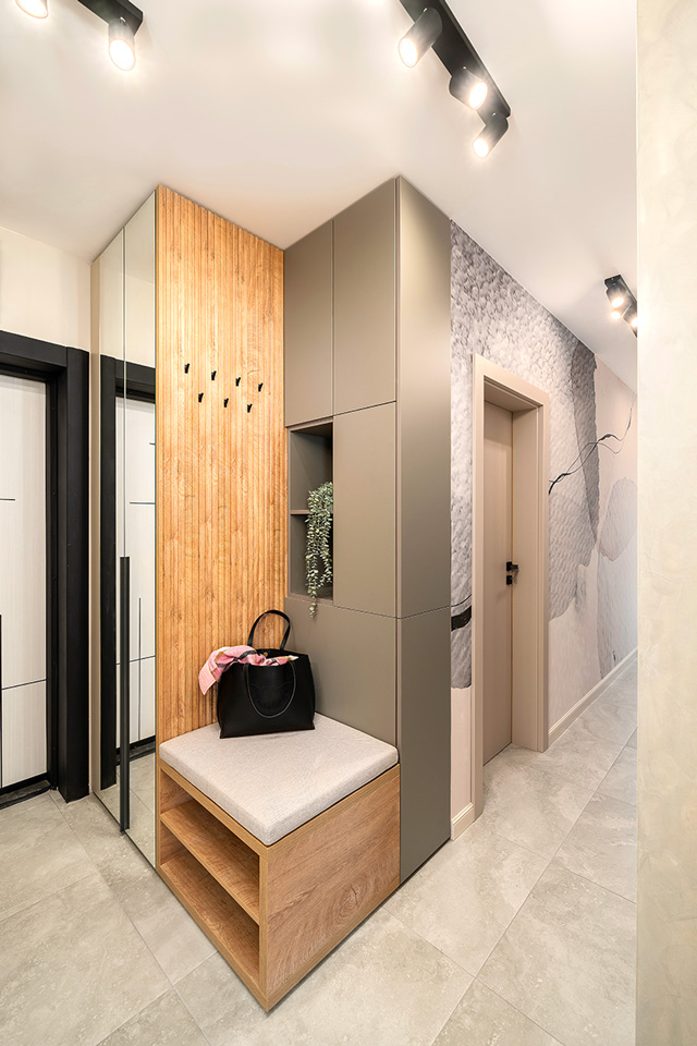 Мебелите в жилището са по проект по поръчка, със скрити ниши и използване на всеки обем.