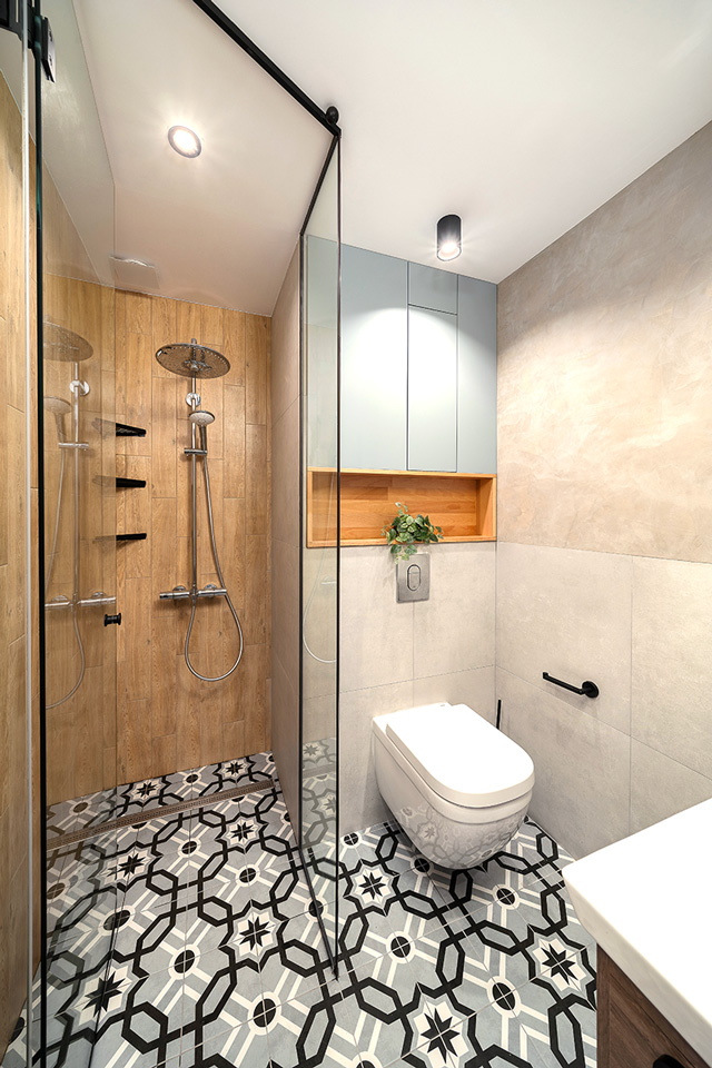 Банята е с два вентилатора, два сифона и душ зона със стъкло от пода до тавана, за да оставя тя суха дори, когато се използва от децата.
