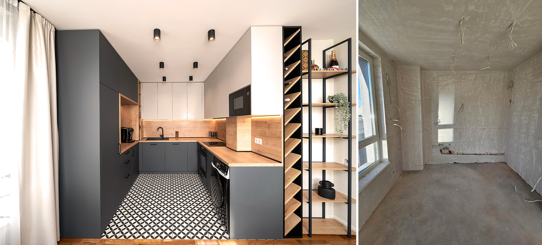 А тук, те са: родителите на двама младежи под 5г. и едно хъски. Южното изложение и високия етаж ни позволиха да затворим единия прозорец в името на голяма П- образна кухня с широк работен плот и два хладилника.