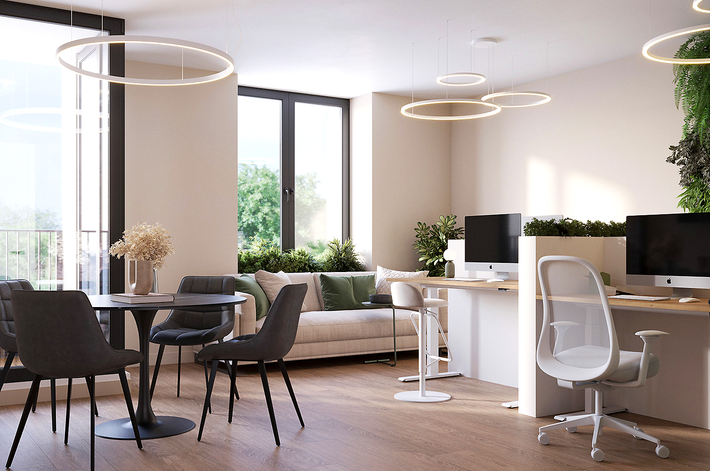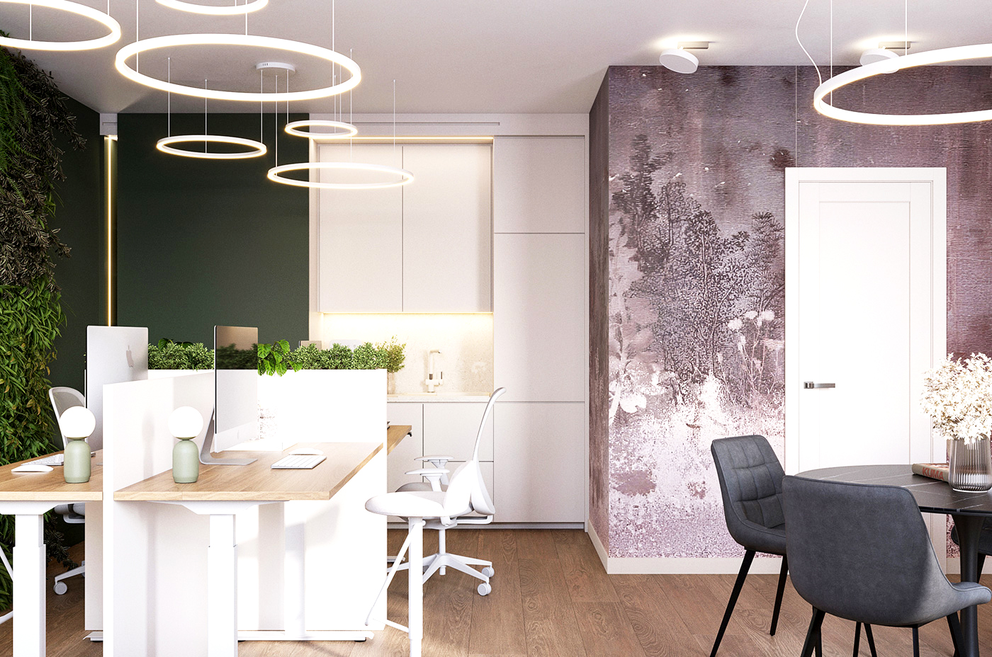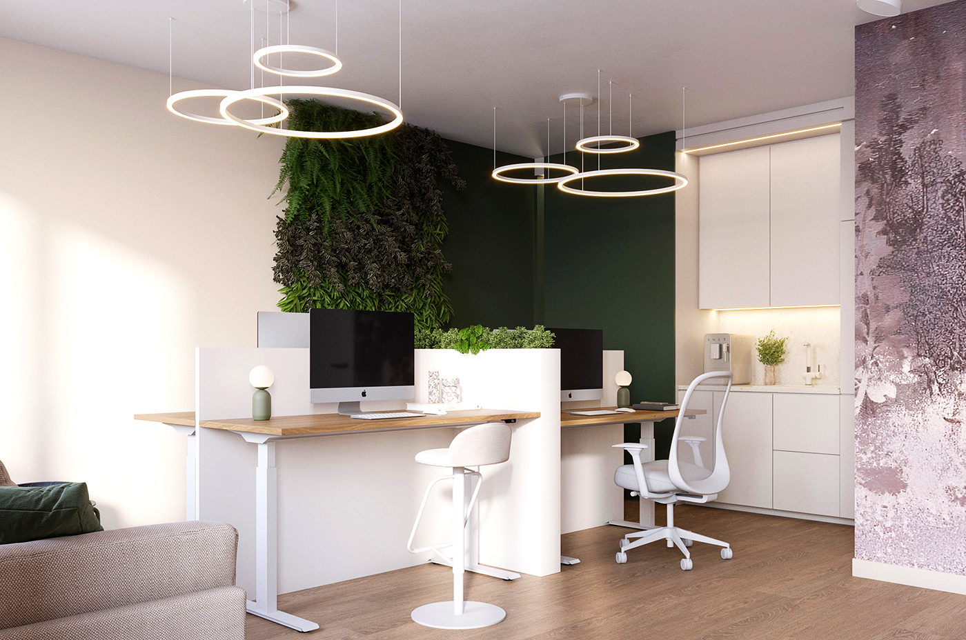 Офис кухнята е скрита зад зелена плъзгаща се врата, така когато тя е затворена се вижда растителността и офис зоната за съхранение на документи и се обособява цяло офис каре.