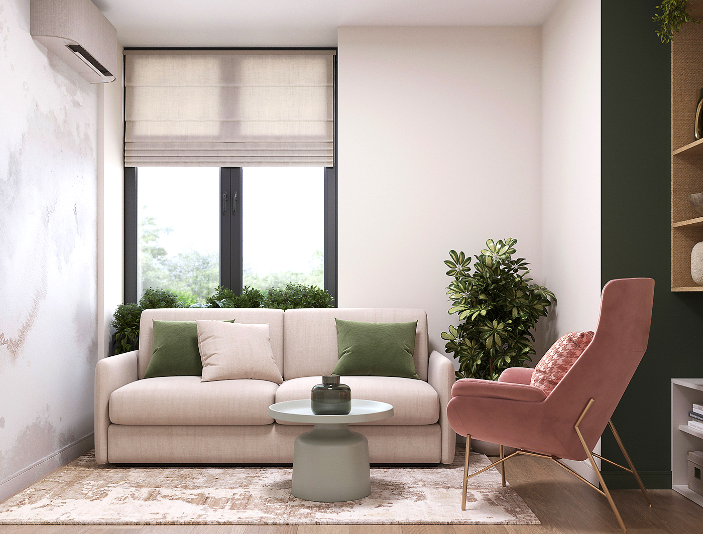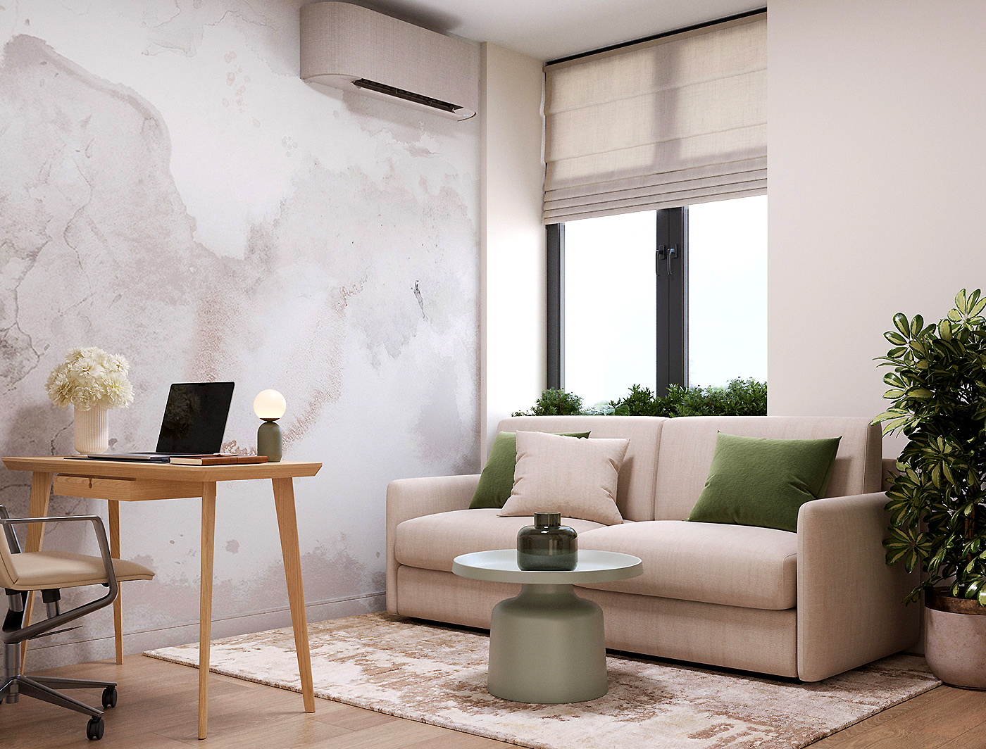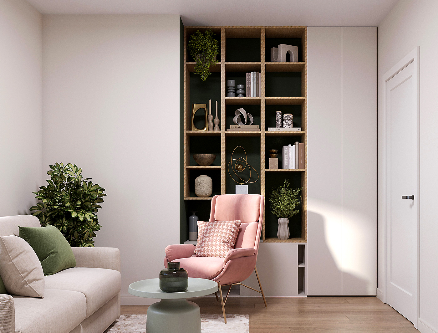 Офис кухнята е скрита зад зелена плъзгаща се врата, така когато тя е затворена се вижда растителността и офис зоната за съхранение на документи и се обособява цяло офис каре.